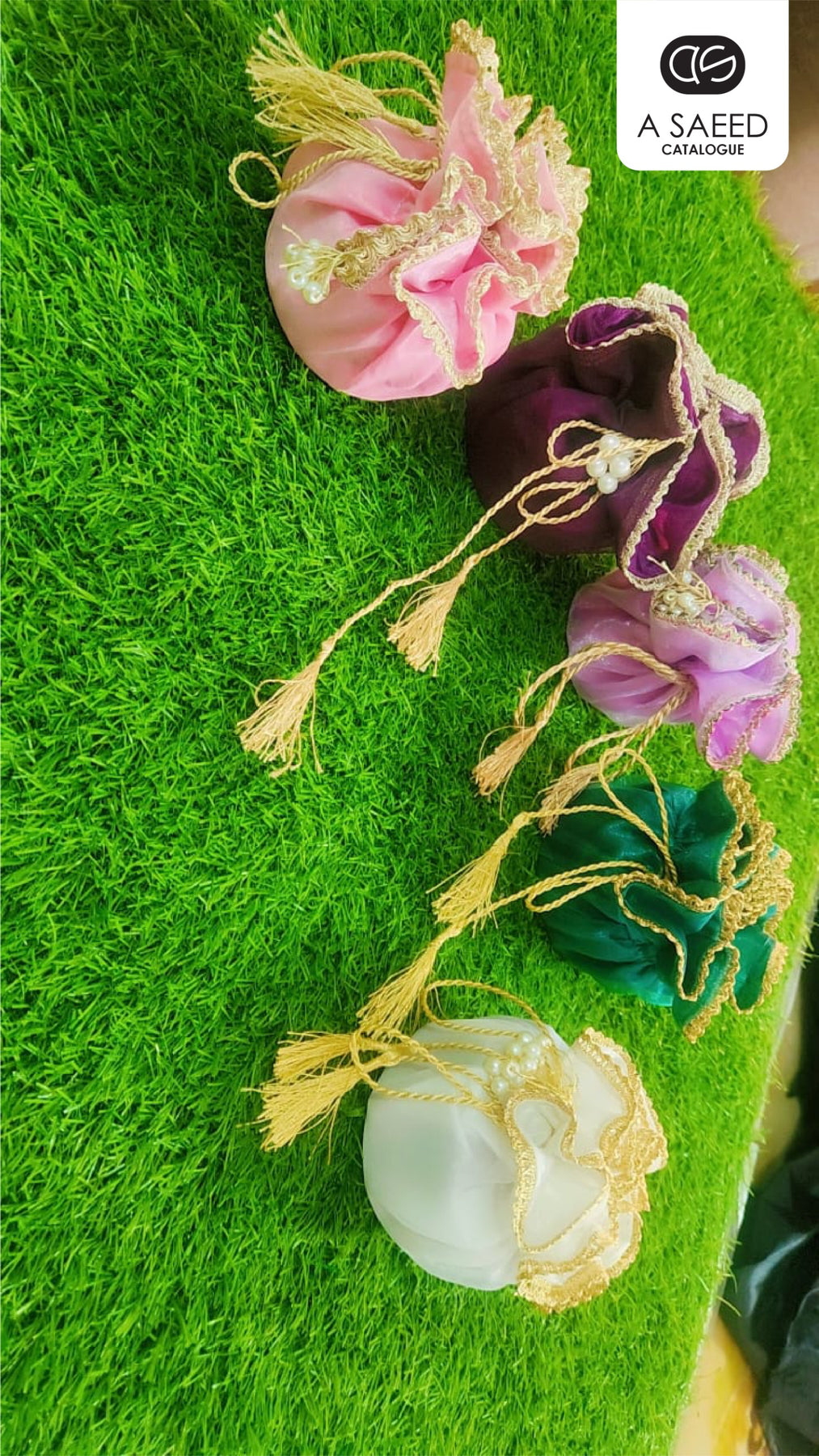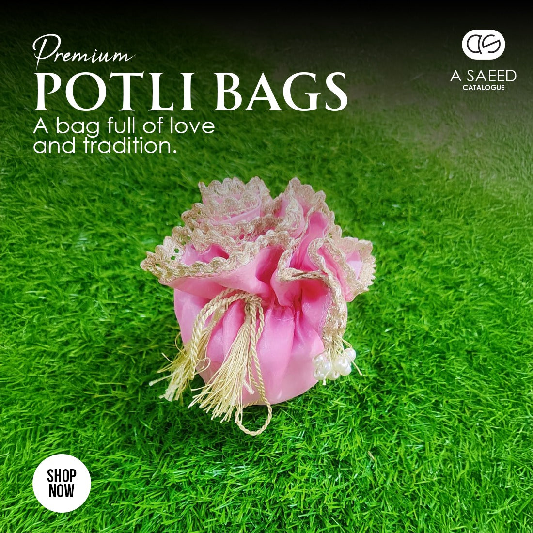 Elegant handcrafted potli bag made from premium organza fabric, designed with lace detailing and a fancy tassel for opening and closing. Perfect for bridal functions, parties, and giveaways. Features pearl hanging for a stylish and luxurious touch.